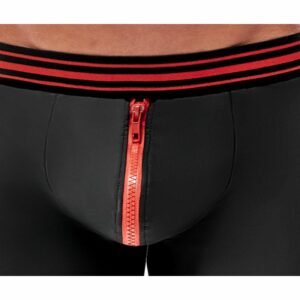Enge betonende Pants von Svenjoyment im edlen schwarzen Mattlook mit auffälligem roten, unterlegtem Reißverschluss im Beutel und breitem gestreiften Webgummibund. Rundum weich und elastisch für maximalen Tragekomfort.