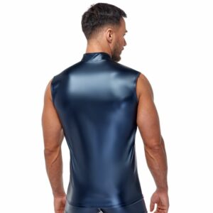 Blaues Shirt von NEK im trendigen Metallic-Mattlook. Ärmellos, eng und körperbetont geschnitten. Mit kleinem Stehkragen und silberfarbenem Reißverschluss vorne. Weich und elastisch für hervorragenden Tragekomfort.