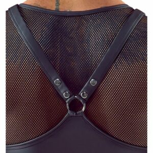 Ärmelloses, betonendes Shirt von Svenjoyment im Brustharness-Style mit Nieten und Ringen. Schwarzer elastischer Material-Mix mit hohem Tragekomfort: stylischer Mattlook und grobmaschiges Netz.