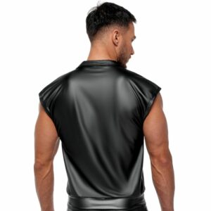 Locker legeres Shirt von NEK im schwarzen edlen Mattlook mit lässig überschnittenem Arm und Stretchbund am Saum. Vorne überlappend offen mit langem, nietenbesetztem Reverskragen. Rundum weich und elastisch für maximalen Tragekomfort.