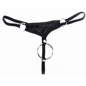 Schwarzer Ministring mit abknöpfbarem Penisring (Ø 5 cm). Weiche Mikrofaser mit schmalen, bezogenen Stretchbändern. 85% Polyamid, 15% Elasthan.
