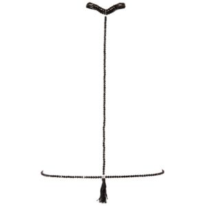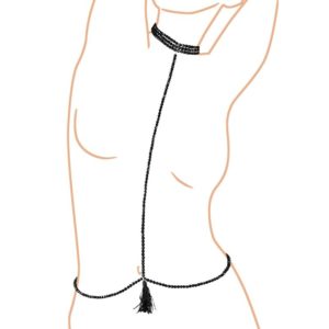 Elastische, dreireihige Perlenkette für den Hals – durch eine weitere Kette verbunden mit der Bikinikette, die hinten mit einem kleinen Karabiner zu schließen ist. Vorne am Bauch ist ein kleiner Fransenpuschel. Schwarz.