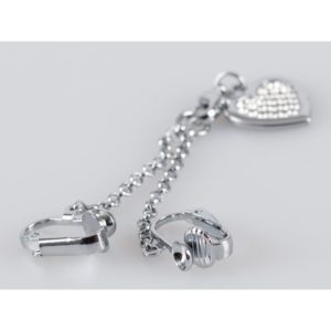 Silberfarbene Intimkette mit strassbesetztem Herzanhänger und Schamlippenspangen.