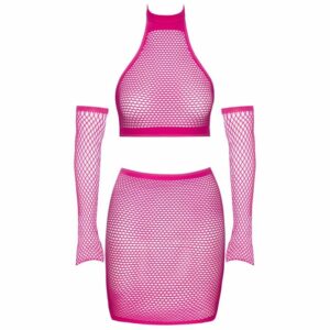 Pinkfarbenes Netz-Set von Cottelli FANTASY mit kurzem Top, Minirock und Armstulpen. Die weichen elastischen Netzmaschen schmiegen sich hautnah an. Alles nahtlos gefertigt und mit weichen Bündchen für hohen Tragekomfort. Rücken- und bauchfreies Top mit hochelastischem Stehkragen-Neckholder.