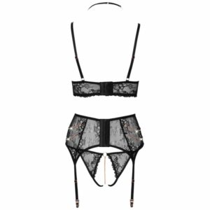 Bralette, Strapsgurt und Slip ouvert vereint im Set von Abierta Fina. Alles ist aus feiner elastischer Spitze gearbeitet und mit roségoldfarbenen Elementen, sowie mit Strass verzierten Kettchen geschmückt. Das Bralette mit seinen geschlitzten Cups erlaubt sinnliche Zugriffe. Der komplett schrittoffene Slip verführt mit einem stimulierenden Kettchen. Und der luftige Strapsgurt in Schnüroptik rundet das freizügige Ensemble elegant erotisch ab. Für optimale Passform sind Träger, Neckholder und Strumpfhalter verstellbar. Die Kettchen sind alle abnehmbar.