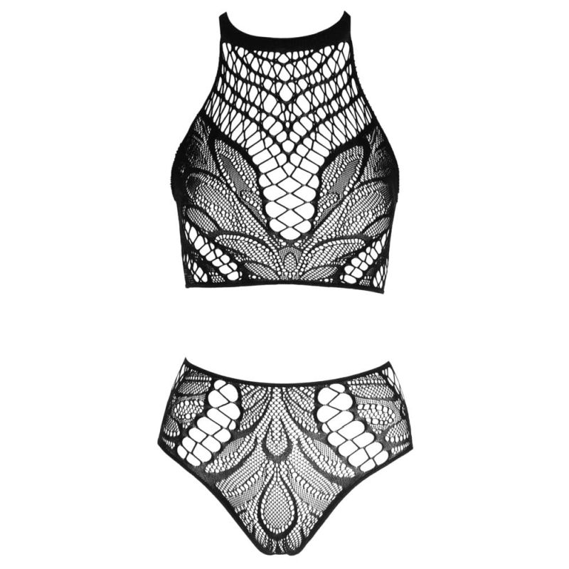 Top und Slip ouvert von NO:XQSE in verschiedenen Netzstrukturen. Top mit elastischem Halsband-Neckholder, im Rücken mit Stretchbändern. Hoch geschnittener Slip im Schritt einladend offen. Alles nahtlos gefertigt und hochelastisch für höchst angenehmen Tragekomfort.