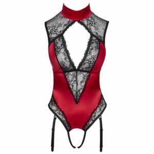 Aufsehenerregender Straps-Body von Cottelli LINGERIE aus edlem rotem Satin mit Einsätzen aus feiner schwarzer Spitze. Rundum weich und elastisch für höchsten Tragekomfort. Raffinierte Schnittführung mit Satin-Halsband zum Knöpfen, schulterbedeckender Spitze und schönem großen Dekolleté-Ausschnitt. Im nahezu freien Rücken mit zwei verstellbaren Hakenverschlüssen. Durch den offenen Schritt führen zwei Stretchriemen. Die Strumpfhalter sind passend verstellbar und auch komplett abnehmbar.