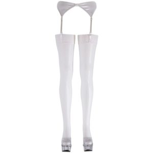 Weiße Straps-Strümpfe mit 7 cm breiter Blütenspitze am oberen Rand. 20den. Oeko-Tex zertifiziert.