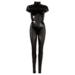 Im schwarz-glänzenden Wetlook mit raffiniert platzierten Powernetz-Einsätzen. Hocherotisch sind die Reißverschlüsse über den Nippeln und durch Schritt. Lässt sich leicht an- und ausziehen, da hinten langer, verdeckter Reißverschluss vom Hals bis zum Po.