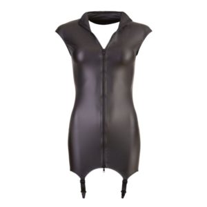 Genießen Sie erotische Augenblicke, wenn Sie dieses Straps-Kleid tragen. Das hochgeschlossene und ärmellose Minikleid aus mattglänzendem Stoff überzeugt mit seinem Zwei-Wege-Reißverschluss vorne und den vier angenähten Strapshaltern. Schwarz. 90% Polyester, 10% Elasthan.