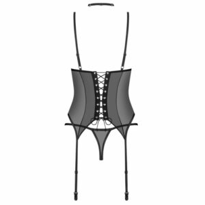 Schwarzes 3-teiliges Set Donarella von Obsessive mit Straps-Corsage, String und Halsband. Aus feinem Stretchtüll mit aufwendigen Stickerei-Einsätzen. Rundum weich und elastisch für hohen Tragekomfort. Straps-Corsage mit kleinem Schmuckelement zwischen den bestickten Bügel-Cups. Im Rücken mit Schnürung. Die Träger und die Strumpfhalter sind passend verstellbar. Der schöne Stickerei-String verführt mit stylischen Stretchbändern. Das verstellbare, eng anliegende Halsband komplettiert den erotisch eleganten Look!