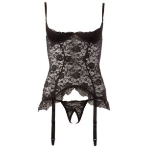 Spitzen-Strapshemd mit leicht gefütterten und offenen Cups. Hakenverschluss hinten. Die 4 Strapshalter sind verstell- und abnehmbar. Mit Rüschenverzierung am Saum. Inklusiver dazu passender String mit total offenem Schritt.