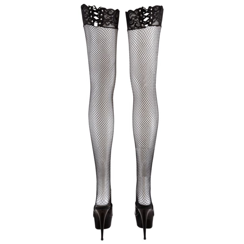 Straps-Strümpfe aus feinem Netzmaterial für traumhaft schöne Beine. Der klassische Spitzenrand wird mit einer Zierschnürung hinten akzentuiert. Ein absolutes Must-have für alle Fashionistas.