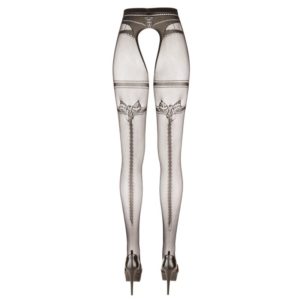 Seidig weiche Netzstrumpfhose ouvert mit eingewebtem Strumpfband und Ziernaht hinten.
