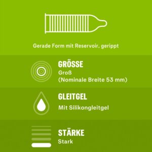 Feucht: 56 mm / Stärke: Mittel; Gerippt/Genoppt: 56 mm / Stärke: Stark; Erdbeere: 56 mm / Stärke: Standard; Gerippt: 53 mm / Stärke: Stark.