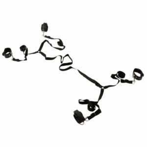 Mit diesem Bettfessel-Set von ZADO lässt sich jedes Bett in einen profimäßigen Bondage-Playground verwandeln. Das H-Gurtsystem aus verstellbaren, reißfesten Webriemen passt unter jede Matratze. An den jeweils 4 Karabinerhaken der Riemen werden dann die Leder-Fesseln für Hände und Füße eingehakt. Die bequemen Hand- und Fußfesselmanschetten aus robustem Leder sind mit Schnallenverschlüssen ausgestattet und somit im Umfang passend verstellbar.