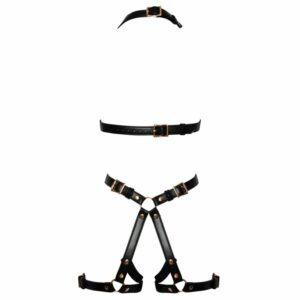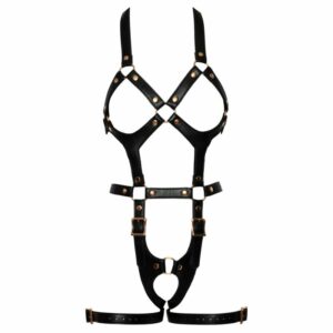 Harness von Bad Kitty in stilvoller Lederoptik mit roségoldfarbenen Metalldetails. Der busenfreie Einteiler ist mit Neckholder, einladend offenem Schritt und Oberschenkelriemen gearbeitet. Die Riemen aus weichem veganen Lederimitat sind für perfekte Passform mit Schnallenverschlüssen vielfach verstellbar.