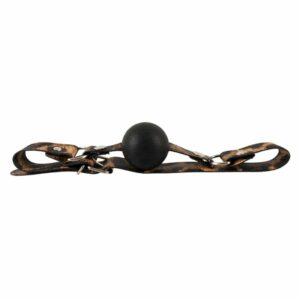 Knebel von Leopard Frenzy (Excellent Power). Schwarzer, runder Silikon-Knebel (Ø 4 cm) an Riemen im Leo-Look, mit Schnallenverschluss im Umfang von 14 cm bis 21 cm verstellbar.
