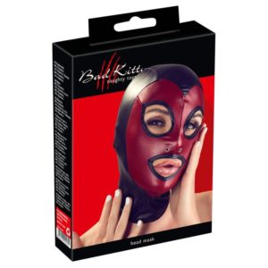 Hochelastische Kopfmaske, die sich hautgenau anschmiegt. Rundherum Schwarz mit rotem Gesichtsfeld. Mit großen, schwarz paspelierten Öffnungen über Augen und Mund sowie Ösen für die Nasenlöcher. Onesize – passt IHM genauso gut wie IHR.