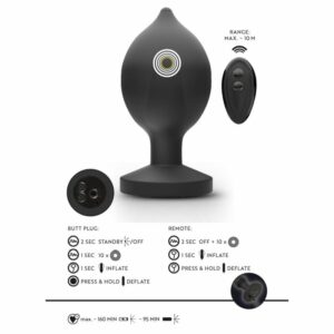 Vibration (10 Modi), Pump- und Luftdruckablass-Funktion (Air Release) sind getrennt über die praktische Fernbedienung (Reichweite bis 10 Meter) oder direkt am Toy bequem per Knopfdruck steuerbar. Der Vibro-Plug pumpt sich in 6 Stufen immer ein Stückchen weiter auf – bis zu max. 6,2 cm im Durchmesser! Um das Volumen des Vibro-Plugs wieder zu reduzieren, drückt man ebenfalls nur aufs Knöpfchen.