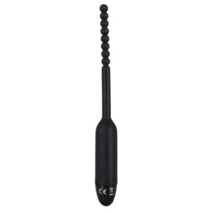 Schwarzer Dilator-Vibrator mit 7 Vibrationsmodi per Knopfdruck. Gesamtlänge ca. 19 cm, Stablänge 10,5 cm, Ø ca. 8 mm. Nahtlos gefertigt für leichtes Einführen Material: Silikon, ABS. Inklusive Knopfzellenbatterien.