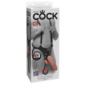 Abnehmbarer Penisdildo an größenverstellbarem schwarzem Komfort-Harness mit Hosenträgern. Penisdildo ist hohl, sodass der Penis eingeführt werden kann.