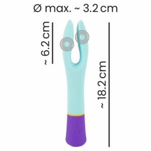 Kraftvoller double vibrator von bunt. im trendigen Color-Blocking. Mit 2 beweglichen Vibro-Armen, die sich perfekt für gezielte Lustpunkt-Stimulationen (z. B. an Klitoris, Nippeln, Hoden, Damm etc.) eignen. Lässt sich auch vaginal und anal einführen. Dabei liegt der leichte Vibrator gut in der Hand und sorgt mit seiner seidigen Soft Touch Textur für höchsten Verwöhnkomfort.